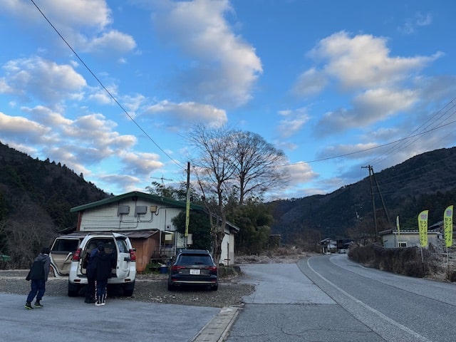 おはようございます。X‘masウィークの火曜日は雲多めの空ですが画像のようにスキー場方向は青空の方が多い空が広がっています。気温は一気に冷えてお店下手の道路脇温度計で0℃、放射冷却も手伝って体感的にはそれ以上の寒さ感じます。この寒さでお店の周りは霜で真っ白の世界になっています。一昨日の気温の高さはなんだったんだろうという感じです。早い時間お出掛けの皆さん、しっかり暖かい格好でいきましょう。画像はお子さんふたりとお父さんの3人ファミリーの出発の図です。いってらっしゃい。