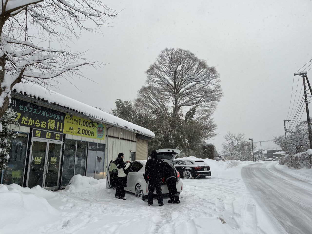おはようございます。昨日日中から夕方にかけて雪も大したことなかったので油断していましたが、昨夜からの雪は多いです。お店前も除雪した後にすでに5cm以上の積雪となっています。柔らかい雪に世界が覆われています。気温も低くお店下手の道路脇温度計で-2℃と氷点下の寒い朝です。道路は道の駅からが除雪が遅く轍が深くなっていて運転しにくいと思います。通過した時ちょうど除雪を始めていたので良くなってくると思います。いつもながらお店付近からは除雪良く路面の雪も少なく運転しやすいと思います。今朝は道路滑りやすそうなので一段とスピードには気をつけて移動して下さい。画像は本日二番目にご来店の若者男性5人組の皆さんの出発の図、いってらっしゃい。しかしアクアに5人分の板ブーツウェアのレンタル品をよく詰め込みました。