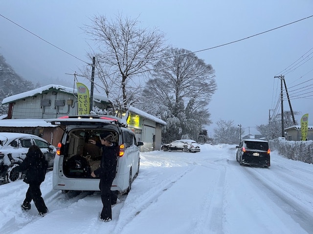 おはようございます。三連休最終日の祝日の朝は、昨日からの雪が降り続いています。お店到着時は降りも緩み細かい雪が少し降っているくらいだったのがまた積もる感じで降っています。お店前も重機除雪入ってもらった上に10cmくらいは積もっています。近隣エリア道路に雪積もっているようですが除雪が悪いというか、入っていないので運転しづらいと思います。早くに移動の皆さんはスピード出さずゆっくりと移動して下さい。画像は本日二番目にご来店のカップルのお二人の出発の図、まとまった雪の中ご来店ありがとうございます。行ってらっしゃい。