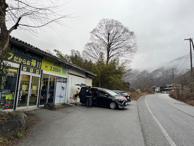おはようございます。今日も心配された雨ですが、この時間霧雨が微かに降っています。ウェザーニュース社の予報ではこの後曇から晴になっているので早い回復を期待しましょう。気温は今日も高め、お店下手の道路脇温度計で+7℃、外に出ても寒さ感じないです。道路は路面少し濡れていますがすぐ乾きそうです。画像は本日二番目に到着の高校生(かな?)とお父さんのお二人の出発の図、いってらっしゃい。親子でスキー場へ、良いですね。