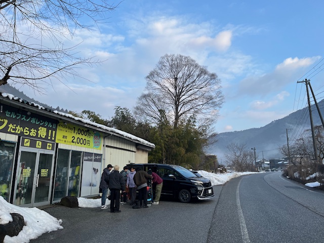 おはようございます。昨日はまとまった雨での残念な朝のスタートでした(早い時間に曇になりました)が今朝は一転画像のように早い時間から綺麗な青空広がる朝を迎えています。気温はお店下手の道路脇温度計で0℃、昨日は久しぶりの+気温でしたがまた寒さ戻っています。道路は昨夜雨が少し当たったのか路面少し濡れていますがすぐ乾きそうです。画像は本日最初に来店してくれた若者男子6人グループの皆さんの出発前の図、いってらっしゃい。さすがに2月、学生さんの活動活発になっているようです。